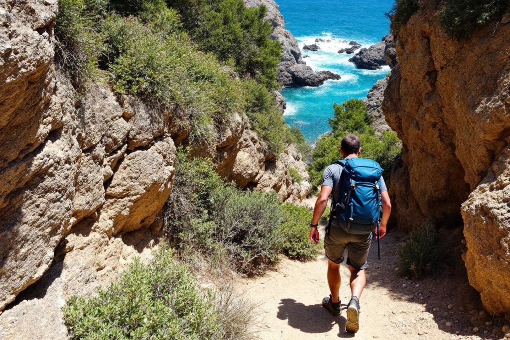 Randonneur sur un sentier rocheux surplombant la mer turquoise